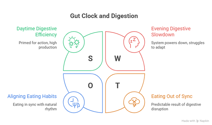 Most people know that the body has a circadian rhythm — the internal 24-hour clock that regulates sleep and waking. What fewer people realise is that your digestive system has its own built-in clock, and it is designed to wind down in the evening.