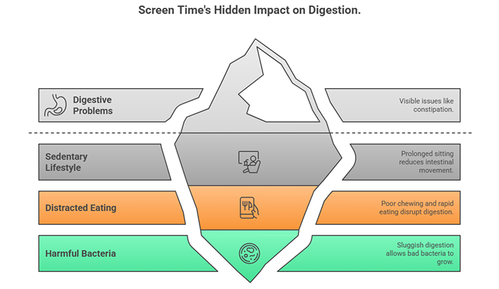 Here’s what’s happening: when you’re glued to screens, you’re not moving. You’re sitting. For hours and hours, day after day. This sedentary lifestyle has direct consequences for your digestive system.