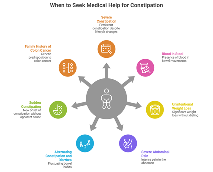 While lifestyle factors cause most constipation, certain symptoms warrant medical evaluation: